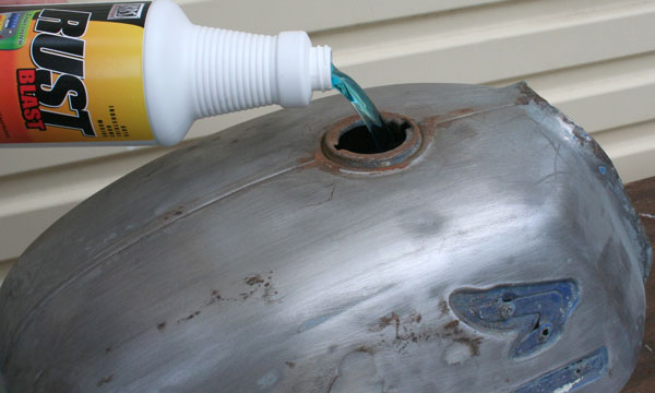 Next, I simply poured in the RustBlast (rust remover). I also left a little in the bottom of the bottle for later, not more than an ounce.This is a simple step … just give it a shake every 3 or 4 minutes to keep the inside surfaces wet. I just did this while I was in the garage working on something else. After about 45 minutes, I drained it out and rinsed it again with water.