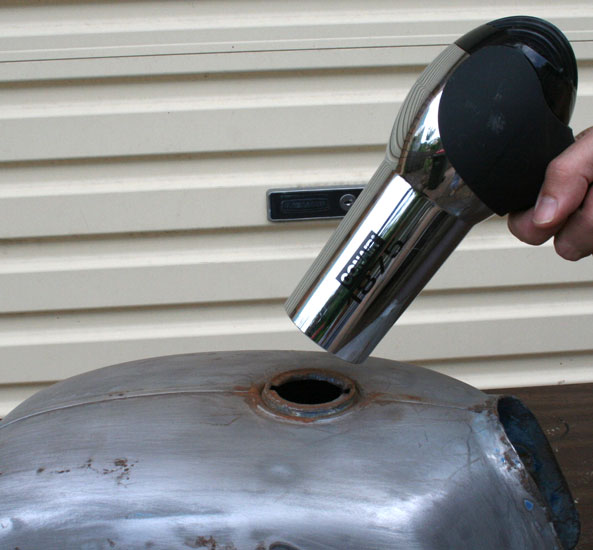 Oh yea … I also treated the outside seems with the remaining RustBlast, just using a small brush.At this point, I made sure that the tank was bone dry on the inside. Now for all you type A personalities out there, do not go and get the gas torch and give it a cook up! One of the easiest ways to get the inside bone dry is to use a heatgun (the type for stripping paint). Or what mostpeople use but do not boast about is their wife’s blowdryer. Just warm the tank up and all the water starts to evaporate. I was able to see the water vapour coming out of the top of the tank. It took about 20 minutes and the inside of the tank was completely bone dry.